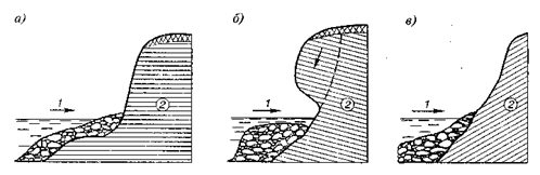 Рис. 12 Устойчивость берега моря в зависимости от напластования пород: а) – средняя; б) – минимальная; в) – максимальная; 1 – волны; 2 – положение слоев пород.