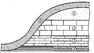 Рис. 14 Осадочная толщина морского происхождения, перекрытые современными наносами; 1 – песок; 2 – известняк; 3 – песчаник; 4 – глины; 5 – современные наносы в виде суглинка.