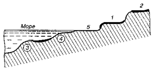 Рис. 13 Строение морского берега, террасы: 1 и 2 – надводные; 3 и 4 – подводные; 5 – пляжная.