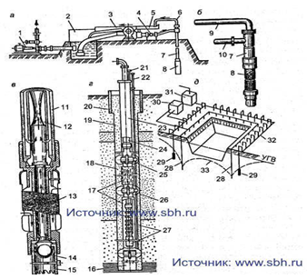 Рис. 18 Водопонижение эжекторными фильтрами, водопонизительными скважинами и электроосмотическим способом а - эжекторная иглофильтровая установка; б - эжекторный иглофильтр; в - его фильтровое звено; г - открытая водопонизительная скважина; д - схема электроосмотического водопонижения; 1 - низконапорный насос; 2 - циркуляционный резервуар; 3 - высоконапорный насос; 4 - распределительный трубопровод; 5 - сливный лоток; 6 - трубопровод; 7 - эжекторный иглофильтр; 8 - водоприемное фильтровое звено; 9 - водоотводящая труба; 10 - труба от насоса; 11 - наружная труба; 12 - диффузор с насадкой; 13 - сетка; 14 - шаровой клапан; 15 - наконечник с зубчатой коронкой; 16 - отстойник; 17 - просеченный лист; 18 - песчано-гравийная обсыпка; 19 - местный песчаный грунт; 20 - кондуктор; 21 - пьезометр для замера уровня воды в скважине; 22 - то же, в обсыпке; 23 - надфильтровая труба; 24 - водоподъемные трубы; 25 - направляющие фонари; 26 - муфта; 27 - насосный агрегат; 28 - трубы-аноды; 29 - иглофильтры-катоды; 30 - двигатель-генератор; 31 - насосный агрегат; 32 - всасывающий коллектор; 33 - пониженный уровень грунтовых вод.