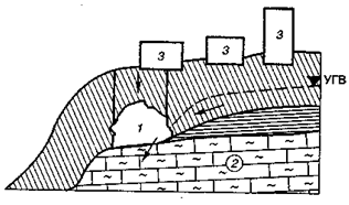 Рис. 19 Суффозионная полость (1) в лессовых породах, залегающих на склоне рельефа, сложенном известняками-ракушечниками (2); 3 – здания.