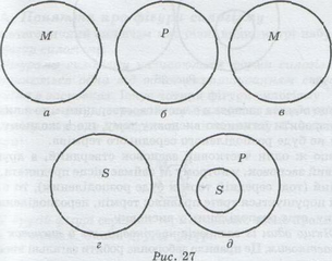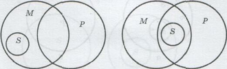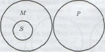 Відношення між термінами S—М—Р категоричного силогізму прийнято відтворювати за допомогою кіл як відношення між обсягами понять, що входять до засновку. Відношення обсягів понять буде таким: якщо обсяг поняття М входить до обсягу поняття Р, а обсяг поняття S входить до обсягу поняття М, то обсяг поняття S входить до обсягу поняття P (Мал. 1). Відповідно, якщо відомо, що клас предметів М не містить ознак Р, то й усякий окремий предмет S, що входить до класу М, не має ознак Р. Так, якщо відомо, що жодна людина не може бути притягнена до кримінальної відповідальності інакше як за рішенням суду, то це означає, що й громадянин Петренко не може бути притягненим до карної відповідальності інакше як за ухвалою суду.