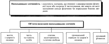З позицій кримінології, поняття "насильницька злочинність" є теоретично обґрунтованим. В основі об'єднання зазначених діянь в окрему кримінологічне значиму групу лежать такі критерії: 1) об'єкт посягання – суспільні відносини, що охороняються кримінальним законом, які забезпечують недоторканність фізичного статусу особи; 2) форма вини – прямий умисел; 3) спосіб дій злочинця – фізичне або психічне насильство; 4) насильство відбувається проти волі потерпілого [13, 256].