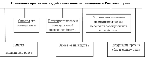 Однако и завещание, составленное с соблюдением всех требований закона, могло утратить силу до открытия наследства, прежде всего вследствие отмены его завещателем, которая в древнейшее время могла быть произведена только путем составления нового завещания, а по преторскому праву уничтожением, срывом с них печатей и т.п. В период империи сначала было постановлено, что завещание утрачивает силу, если до истечения десяти лет со дня его составления не будет открыто наследство, а затем во изменение этого правила, Юстиниан постановил, что по истечении десяти лет завещание может быть изменено соответствующим заявлением в присутствии трех свидетелей. В период империи допускалось также внесение в завещание изменений путем составления кодициллов и распоряжений о фидеикомиссах. Основания, по которым завещание признавалось недействительным, представлены на рис.2.