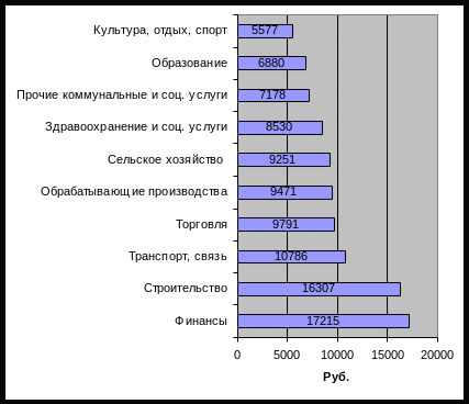 Таким образом, в 2007 году средняя номинальная заработная плата в районе увеличилась на 30% по сравнению с 2006 годом. Средняя номинальная заработная плата, начисленная за 2008 год, составила 9968 рублей и увеличилась по сравнению с 2007 годом на 27,3%. Показатели заработной платы в районе по отраслям экономики в 2008 году представлены на рисунке 5.
