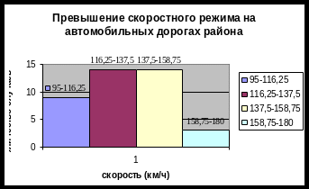 ВЫВОД: из данной статистической сводки видно, что при проведении мероприятий по выявлению нарушения скоростного режима на автомобильных дорогах района чаще всего регистрировалась скорость от 116,25 км/ч до 158,75 км/ч. Меньше всего при проведении мероприятий по выявлению нарушения скоростного режима на автомобильных дорогах района меньше всего регистрировалась скорость от 158,75 км/ч до 180 км/ч.