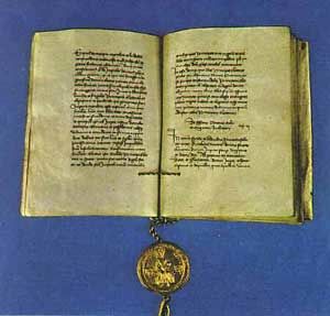 1. Мы узнали также из вполне ясных известий и преданий древних, что с незапамятных времен теми, кто нам счастливо предшествовал, беспрерывно соблюдалось то, что избрание римского короля, будущего императора, совершалось в вольном городе Франкфурте, первая коронация - в Ахене, а первый его королевский сейм проводился в городе Нюрнберге; поэтому мы объявляем, что по тем же основаниям вышеуказанное должно соблюдаться и на будущее время, если этому или чему-либо из этого не встретитгся законное препятствие...