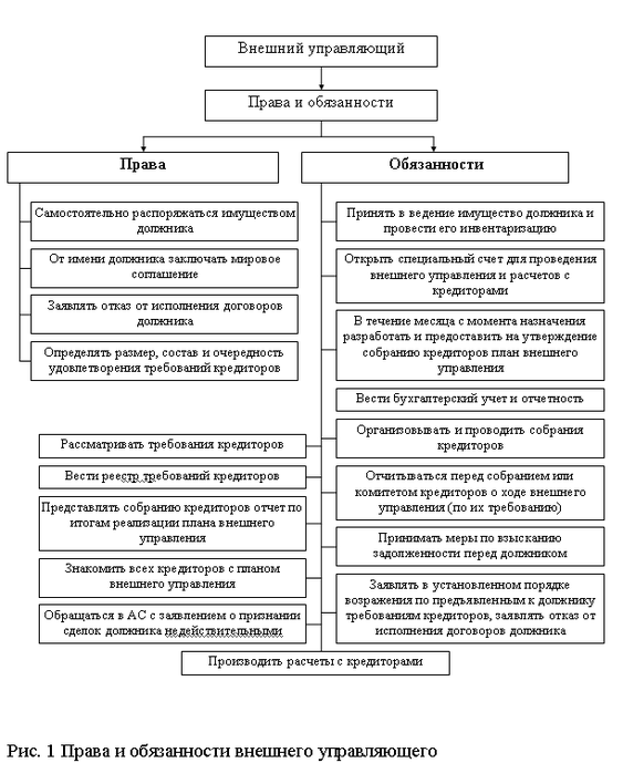 Законы о банкротстве разных стран рассматривают различные стадии процедур несостоятельности, но все они, как правило, начинающиеся с внешнего управления имуществом должника. На этой начальной стадии внешний управляющий имеет широкие полномочия, предоставленные либо судом (Франция, Германия), либо кредиторами во внесудебных процедурах (Великобритания и еще 70 стран англосаксонской правовой системы), и позволяющие изымать и продавать имущество должника, изучать информацию о должнике, учитывать интересы кредиторов, предлагать ликвидацию, мировое соглашение или реабилитацию должника (рис. 1).