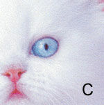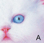 A - тиражного флексографского оттиска; B - растрированной цветопробы и C - полутоновой. Мелкие детали, видимые на полутоновой цветопробе (например, усики котенка) теряются при растрировании