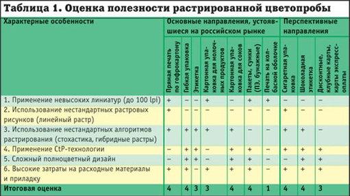 Для решения таких задач растрированная цветопроба просто незаменима и позволит существенно облегчить операции контроля. Попытаемся оценить ее полезность для производителей упаковки и этикетки. Рассмотрим табл. 1.