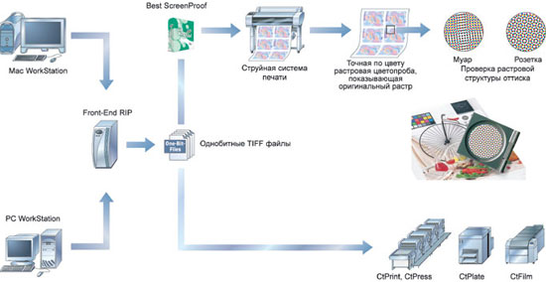 Так как подобные растровые процессоры пока редки, мы будем рассматривать принципы работы цифровой цветопробной системы с передачей растра и методику получения цветопроб на примере растрового процессора Best ScreenProof.