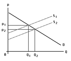 Accordingly, the figure shows the subsidy shifting the supply curve to the right, from S1 to S2. The vertical distance is the amount of the subsidy: one dollar per bushel. Demand is D, as usual. With supply S1 -- before the subsidy is given -- the market equilibrium price is p1 and the equilibrium production is Q1. With supply S2 -- when the subsidy is given -- the market equilibrium price is p2 and the equilibrium production is Q2. We may conclude that a subsidy per unit of production reduces the market price (though not quite by the full amount of the subsidy) and increases the production of the item subsidized.