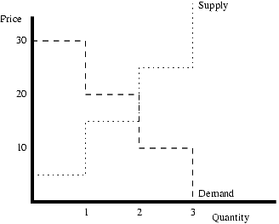 We have defined "demand" as a relation between the price of the good and the quantity consumers want to buy. Similarly, we have defined "supply" as the relation between the price and the quantity that producers want to sell. When we put these two concepts together, we identify the market "equilibrium" with the price and quantity at the intersection of the demand and supply relations -- that is, a price just high enough that quantity demanded is equal to quantity supplied, and the quantity corresponding to that price.