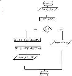 Пример разветвляющегося алгоритма – алгоритм решения квадратного уравнения. Появление условия при решении этой задачи связано с отсутствием корней при отрицательном дискриминанте. Рассмотрим блок-схему этого алгоритма: