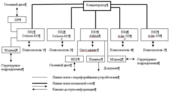 Все ПК с операционной системой Windows NT объединены в локальную сеть с возможность обмена информацией, 100 Mbit/c через сетевой концентpaтop. Администрирование сети осуществляется с помощью программы Windows NT Server, установленного на ПК3 (сервере сети). Через сервер локальной сети (ПК3) и ПК1 организован удаленный доступ через модемы2 к корпоративной сети структурных подразделений, расположенных не в данном помещении.