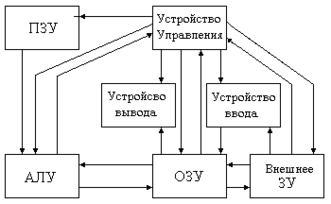 Во время решения задачи программа и операнды (числа, над которыми производится операции) находятся в оперативной памяти (ОЗУ). Быстродействие ОЗУ соизмеримо с быстродействием АЛУ. В процессе решения задачи АЛУ постоянно взаимодействует с ОЗУ, передавая в ОЗУ промежуточные и конечные результаты и получая из ОЗУ операнды действия всех частей ЭВМ при решении задачи осуществляется под воздействием управляющих сигналов, вырабатываемых устройством управления в соответствии с программой, записанной в ОЗУ.