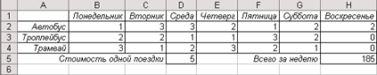 Подготовьте таблицу для расчета ваших еженедельных трат на поездки в городском транспорте: