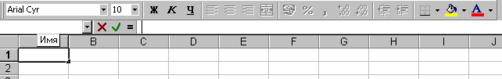 Поле имени - это окно слева от строки формул, в котором выводится имя ячейки, где расположен маркер. В поле имени можно задать имя ячейки или интервала ячеек. Для диаграмм поле имени идентифицирует выделенный элемент диаграммы. Например, если выделена легенда, появится слово "Легенда", если выведен код Р1Т3, это означает, что выделена третья точка первого ряда данных. Просмотр списка имен осуществляется нажатием кнопки.
