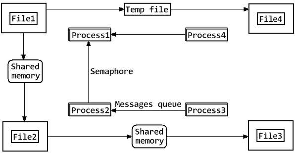 Процессы будут обмениваться через разделяемую память и временный файл.