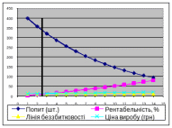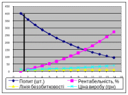 Далі надамо два графіка залежностей ціни, попиту, рентабельності і наведемо на нім лінії беззбитковості і точки беззбитковості, та побачимо як зсунулася рентабельність та точки беззбитковості.
