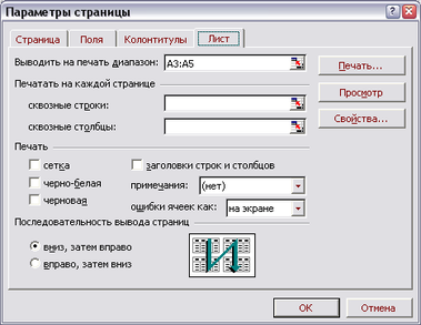 В диалоговом окне Параметры страницы можно задать дополнительные опции печати. Можно спрятать или напечатать линии сетки, добавить на отдельном листе примечания к ячейкам, напечатать цветные рабочие листа черно - белым, напечатать заголовки строк и столбцов. Для этого выберите команду Параметры страницы меню Файл и щелкните по вкладке Лист. В зоне Печать диалогового окна поставьте или удалите нужные опции печати. В зоне Последовательность вывода страниц выберите одну из опций. После чего щелкните по кнопке ОК.