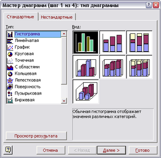Появится диалоговое окно Мастер диаграмм (шаг 1 из 4). Выберите тип диаграммы из соответствующего списка, а потом ее вид. После чего щелкните по кнопке Далее>. У вас есть возможность увидеть предыдущий вид диаграммы, нажав левой кнопкой мыши на кнопку Просмотр результата.