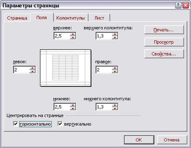 Опции программы Excel позволяют управлять выведением на печать данных рабочих листов и диаграмм. Можно использовать команду Просмотр для предварительного просмотра данных перед печатью. Команда Параметры страницы позволяет установить поля, ввести верхние и нижние колонтитулы.