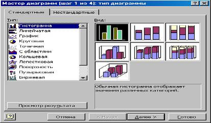 На закладке Стандартные представлены основные типы диаграмм. Каждый тип имеет несколько различных видов. Щелкнув мышью нужный тип диаграммы, в окне Вид можно подобрать конкретный вид представления данных.