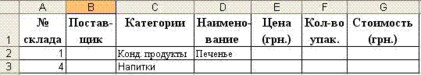 Введите требуемые критерии отбора записей в строки, расположенные под заголовками условий. На рисунке представлен образец диапазона условий отбора: показать в списке строки содержащие кондитерские продукты типа печенье в первом складе и напитки в четвертом складах.