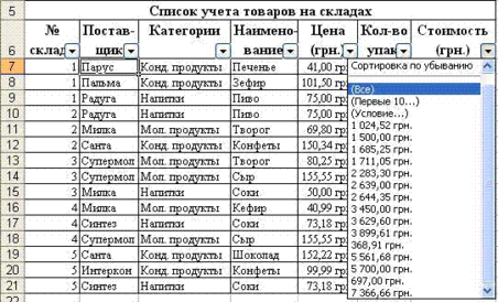 На рисунке представлен отфильтрованный список по столбцу «Цена» при выбранных условиях отбора.