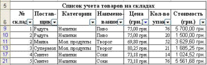 Щелкните на кнопке ОК для выполнения фильтрации. В списке будут отображены записи, удовлетворяющие заданным критериям. Для примера выберем следующие условия отбора: показать в списке строки, содержащие продукты, цены которых больше или равны 69,80 руб. и меньше 99,99 руб.