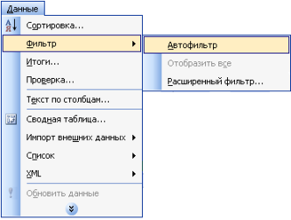 с помощью меню Данные - Фильтр - Автофильтр - раскрывающийся список команд автофильтра.