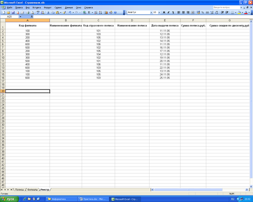 2. Организовать межтабличные связи для автоматического заполнения граф реестра: «Наименование филиала», «Наименование полиса», «Сумма полиса, руб.», «Сумма скидки по дисконту, руб.».