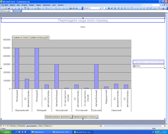 2) построим соответствующую сводную таблицу, предусмотрев возможность одновременно отслеживать итоги и по виду полиса.