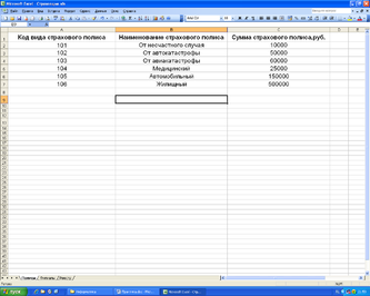| Код вида страхового полиса | Наименование страхового полиса | Сумма страхового полиса, руб. |