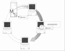 Один из принципов передачи данных в кольцевой сети носит название передачи маркера. Суть его такова. Маркер последовательно, от одного компьютера к другому, передается до тех пор, пока его не получит тот, который "хочет" передать данные. Передающий компьютер изменяет маркер, помещает адрес получателя в данные и посылает их по кольцу.