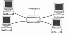 При топологии "звезда" все компьютеры с помощью сегментов кабеля подключаются к центральному компоненту, именуемому концентратором5 (hub) (рисунок 3).
