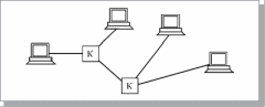 В случае звездно-кольцевой (star-ring) топологии (Рисунок 9) в кольцо объединяются не сами компьютеры, а специальные концентраторы, к которым в свою очередь подключаются компьютеры с помощью звездообразных двойных линий связи.