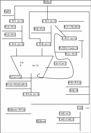 Рг1 для приёма множимого; Рг2 для приёма множителя. Входной РгА сумматора для размещения в нём очередной добавляемой компоненты к сумме частичных произведений. Входной РгБ См используется для размещения текущего значения суммы частичных произведений. Рг2' используется для формирования сдвига множителя вправо по разрядной сетке. Выходной РгСм, в котором формируются текущее значение суммы частичных произведений. Счётчик циклов используется для отображения количества обрабатываемых разрядов множителя.