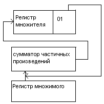 Все компоненты имеют одинаковую размерность, соответствующую слову, обрабатываемому в АЛУ. Регистр множителя должен иметь цепи сдвига вправо. Сумматор частичных произведений должен иметь также цепи сдвига вправо. Причём, младшие разряды соединяются со старшими разрядами регистра множителя. В результате производится анализ младшей цифры множителя после чего, если равны «1», то к текущему значению суммы частичных приведений (который первоначально равен «0») добавляется содержимое регистра множимого. Если, анализируемая цифра равна «0», то операция сложения не выполняется после этого содержимое регистра множителя сдвигается вправо на один разряд и в освободившийся старший разряд регистра множителя переносится младший разряд суммы частичных произведений, в результате сдвига её вправо по разрядной сетке. Далее продолжается с анализа разряда. В результате после окончания операции в регистре множителя: младший разряд результата, а в сумматоре – старшая часть разряда.