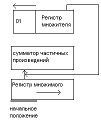Сумматор частичных произведений и регистр множимого имеет двойную длину (двойную разрядность), регистр множителя – цепи сдвига влево, регистр множимого – вправо. Производится анализ старшего числового разряда множителя, если он равен «1», то к текущему значению суммы частичных произведений добавляется содержимое регистра множимого. Содержимое регистра множителя сдвигается влево, а регистр множимого – вправо на один разряд. Процесс продолжается до анализа последнего младшего разряда множителя.