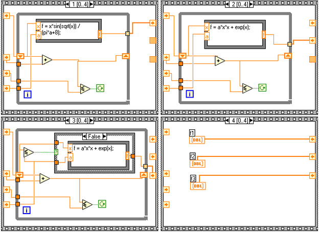 Для выполнения индивидуального задания №1 используются исходные данные предыдущей лабораторной работы №6 (табл. 1), но с использованием многослойной структуры. В первом слое необходимо сделать ввод всех исходных данных от рукояток интерактивного задания параметров. Во втором слое необходимо просчитать функцию f1 от начального и до конечного значения аргумента х. В третьем слое необходимо сделать тоже самое со второй функцией f2. А в четвертом слое необходимо рассчитать заданную функцию У в зависимости от условия х><=а. В пятом слое необходимо вывести всю информацию на три отдельных осциллографа или вывести все три функции на трехвходовый осциллограф цветными линиями.
