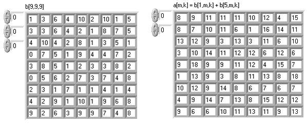 | 7 | 9*9*9 | Суммировать и вывести на рабочий стол элементы 1й и 5й плоских матриц |