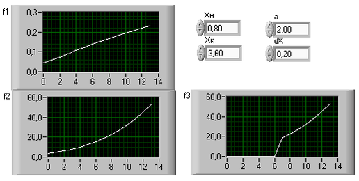 Функцию f1 просчитать в первом окне кассетной структуры. Во втором окне просчитайте функцию f2 в зависимости от условия х><=а. Выведите всю информацию на осциллограф.