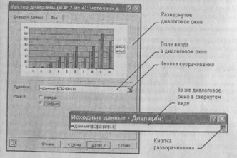 Все диалоговые окна программы Excel, которые требуют указания номеров или диапазонов ячеек, содержат кнопки, присоединенные к соответствующим полям. При щелчке на такой кнопке диалоговое окно сворачивается до минимально возможного размера, что облегчает выбор нужной ячейки (диапазона) с помощью щелчка или протягивания (рис. 3).