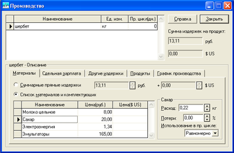 В окне Производство активизируем закладку Материалы, включаем переключатель Список материалов и комплектующих. Данные по материалу переносим в окно Производство, вводим «Расход».