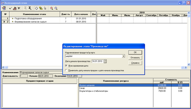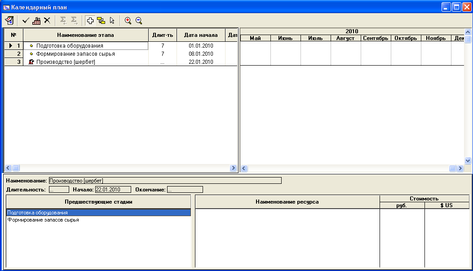 Добавляем этап Производство, вернувшись в окно Календарный план, устанавливаем начало производства с 16.01.2010г.