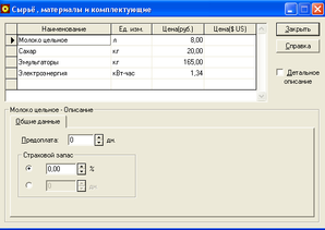 Рис. 21 Окно «Сырье, материалы и комплектующие» из меню «Операционный план»