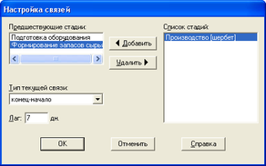 В открывшемся окне Настройка связей переносим из окна Список стадий в окно Предшествующие стадии с помощью кнопки Добавить стадии «Подготовка оборудования», «Формирование запасов сырья» и указать длительность – 7 и 7 дней.