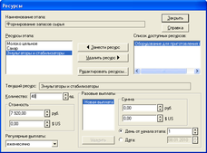 Рис. 15 Окно «Ресурсы» из меню «Редактирование этапа проекта» - «Формирование сырья»